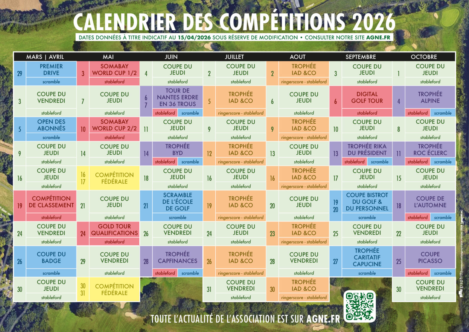 À noter : suite aux attentes dont vous nous avez fait part au travers du questionnaire, les compétitions proposeront cette année, à chaque fois que cela sera possible et sauf contrainte règlementaire, la double option stableford ou scramble à deux. Le bilan sera fait en fin de saison quant au renouvellement du principe.